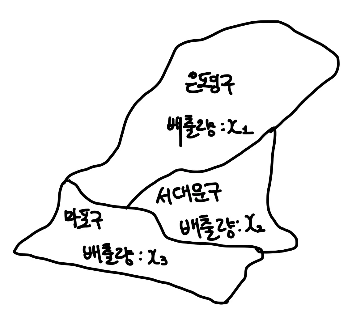예를 들어, 서울시의 구들의 쓰레기 배출량이 areal data가 될 수 있다. 이때 구들은 셀 수 있게끔 고정되어 있다.