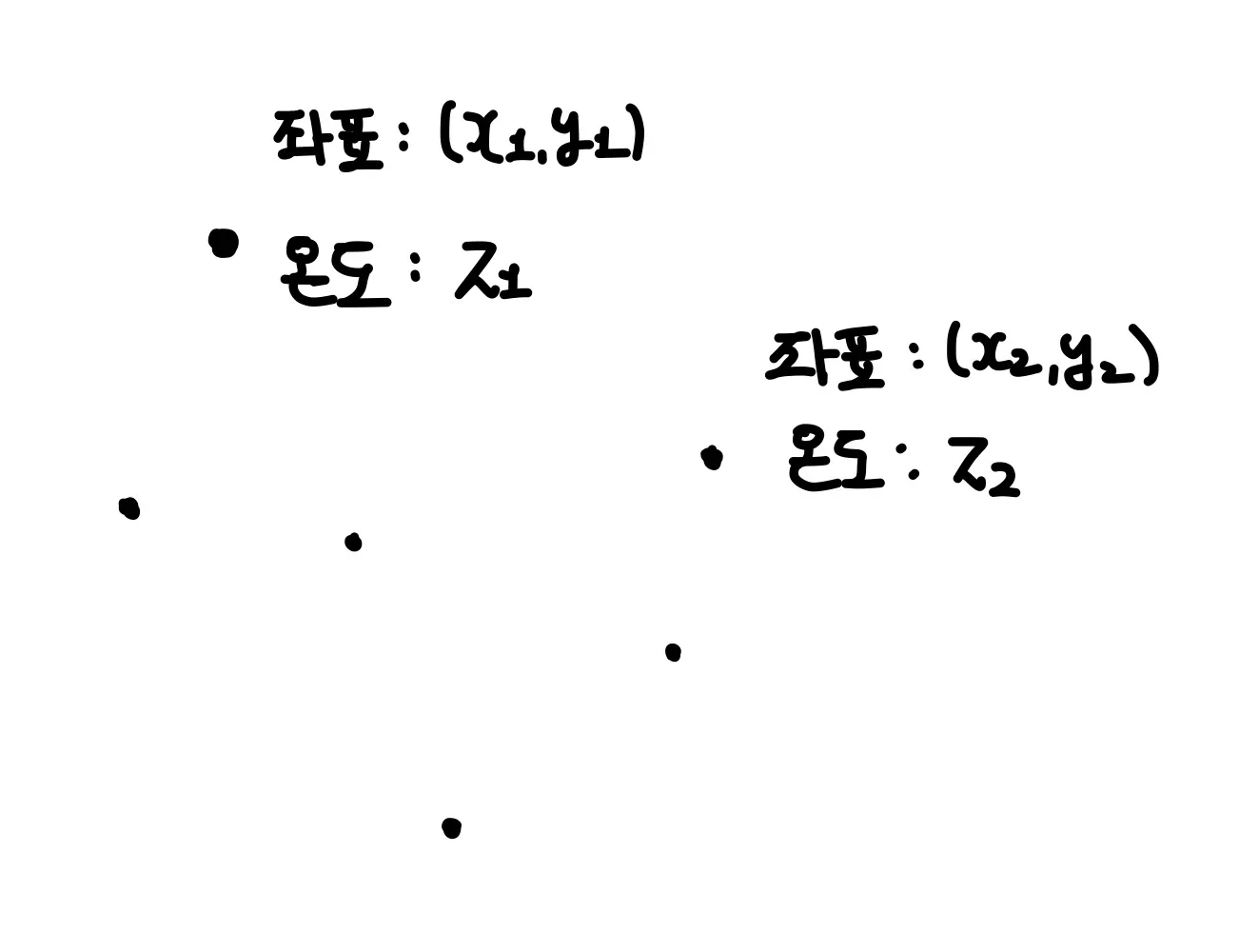 예를 들어, 특정한 좌표 지점의 온도를 생각했을 때, 좌표값은 위치값에 해당하며 해당 위치에서의 특정한 정보값은 온도가 될 것이다.