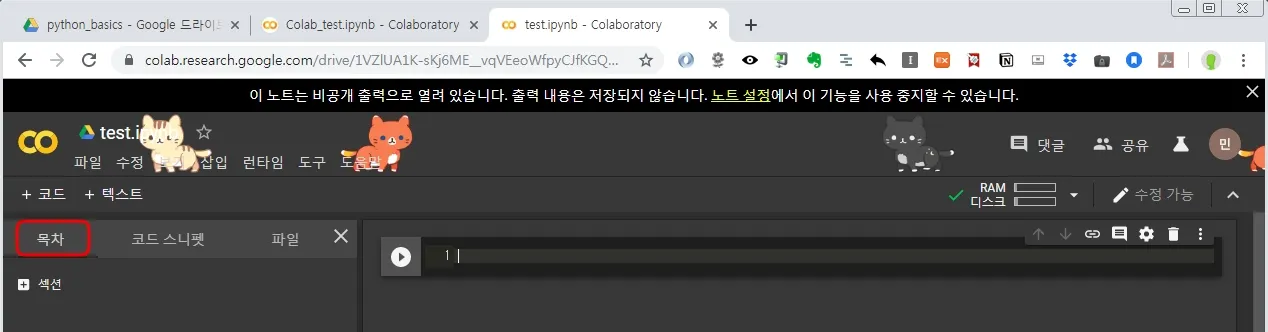 아래와 같이 [>] 모양의 버튼을 클릭하면, 목차, 코드스니펫, 파일등의 기능을 활용할 수 있다.