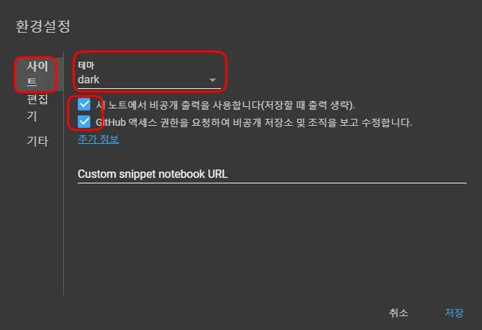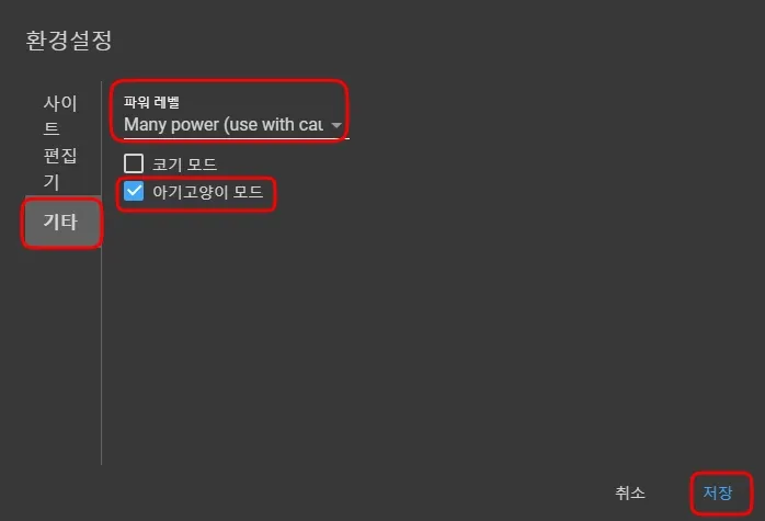 (좌측) 기타 탭 클릭 > 원하는 설정을 적용 > 저장 을 클릭한다.
