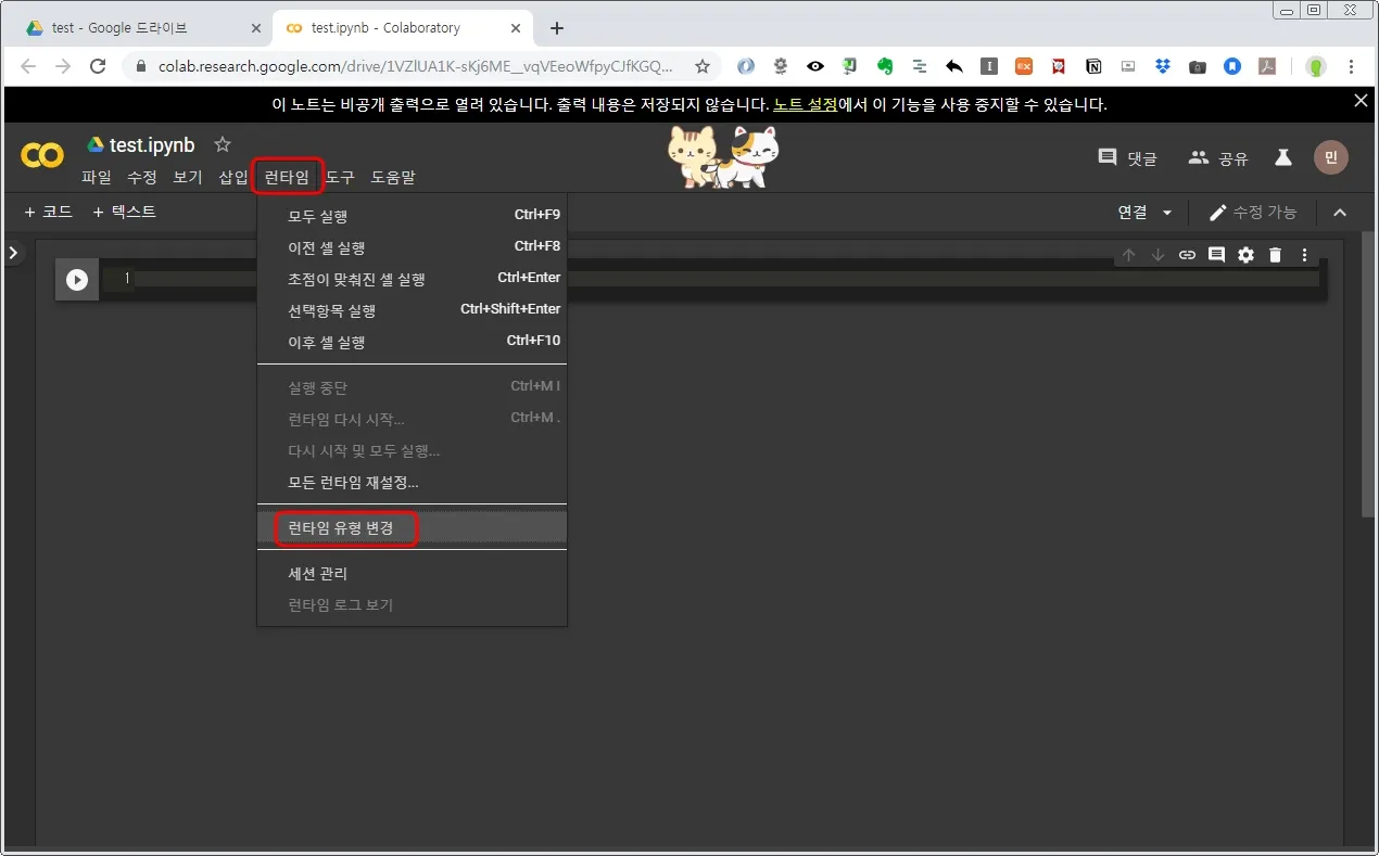 상단 메뉴 런타임 > 런타임 유형 변경 을 클릭한다.