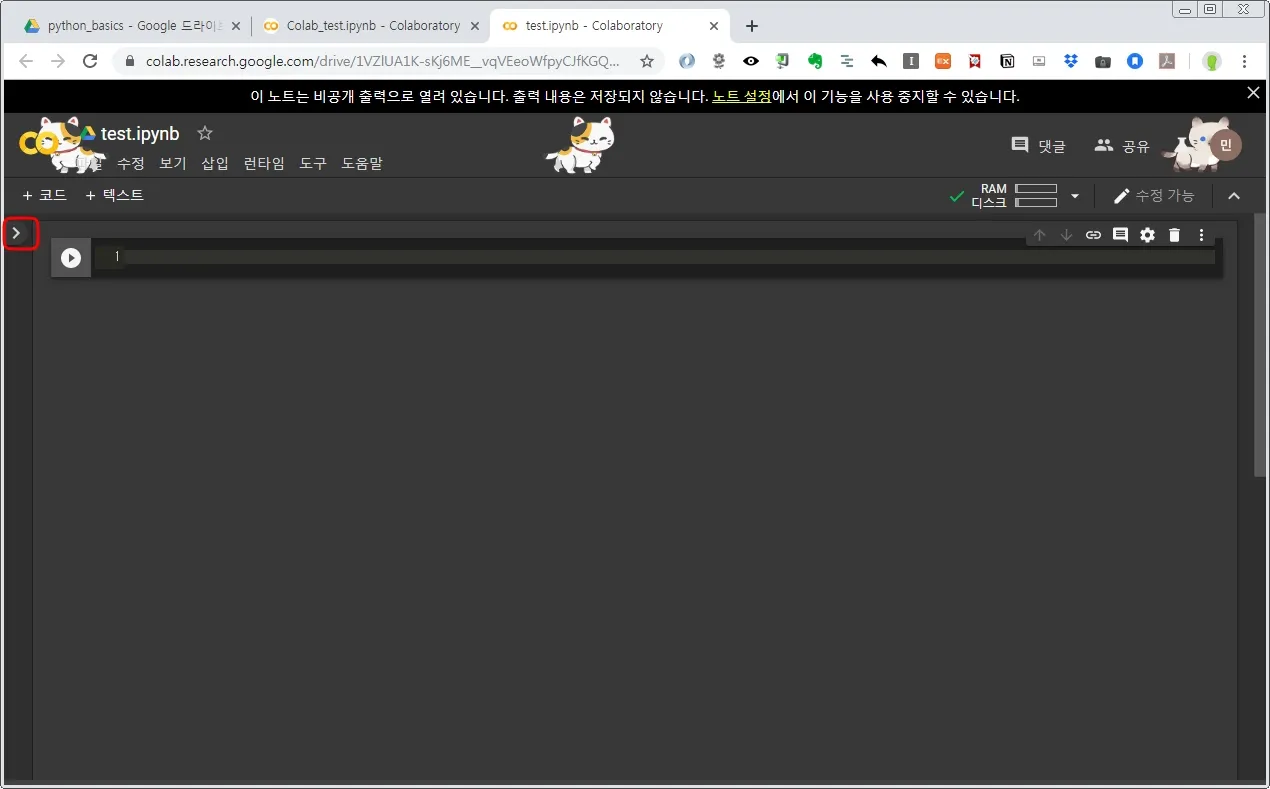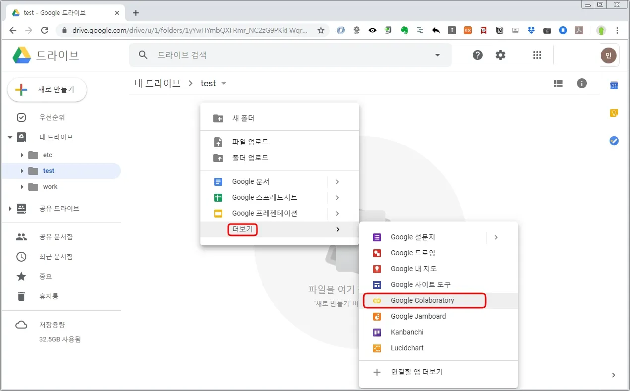 드라이브 메인화면으로 이동 > 우클릭 > 더보기 > Google Colaboratory 클릭