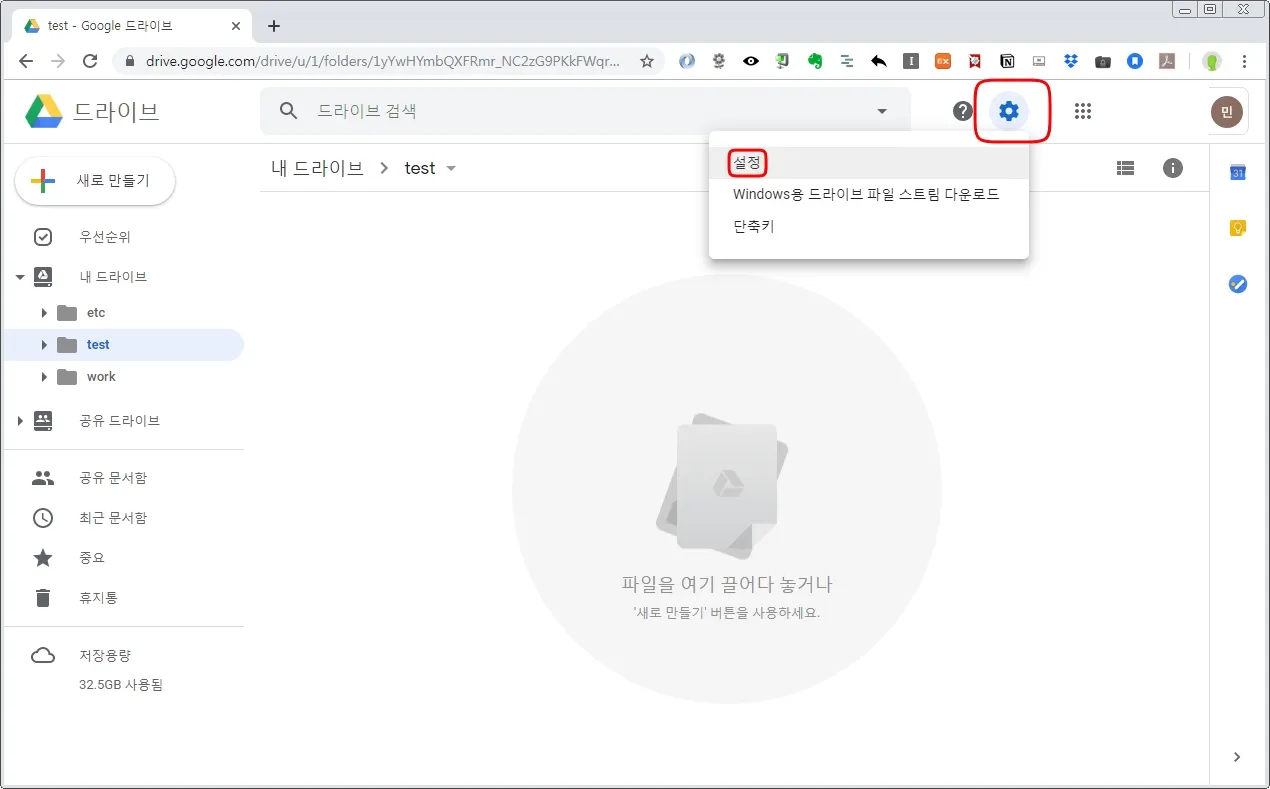 드라이브 메인화면으로 이동 > 톱니바퀴 모양 버튼 클릭 > 설정을 클릭한다.