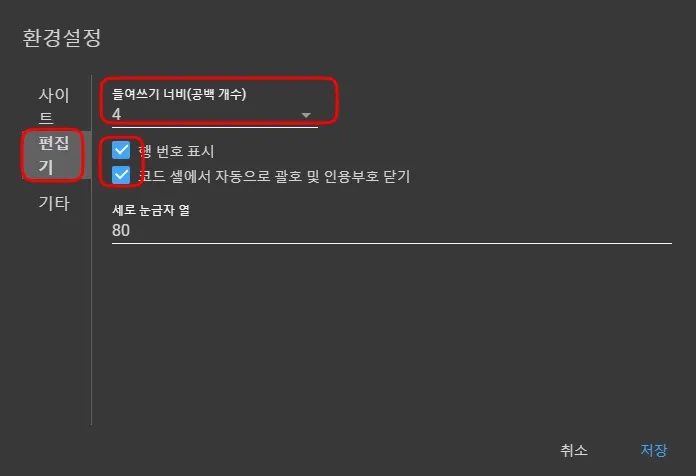(좌측) 편집기 탭 클릭 > 들여쓰기 4선택 > 체크박스 2개 체크