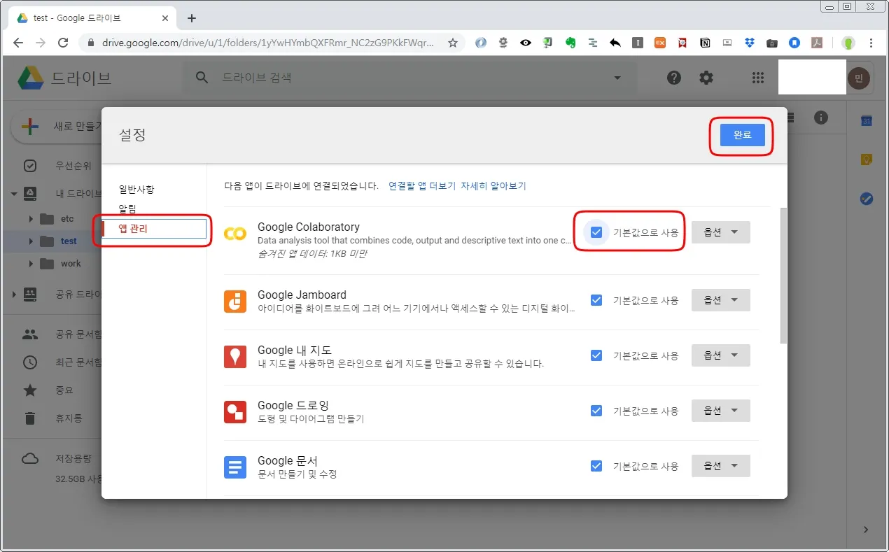 새로 뜬 팝업의 좌측 메뉴 앱관리 클릭 > Google Colaboratory 우측의 기본값으로 사용 체크박스 클릭 > 완료 를 클릭한다.