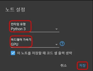 런타임 유형은 Python3를, 가속기는 GPU를 선택 > 저장 을 클릭한다.