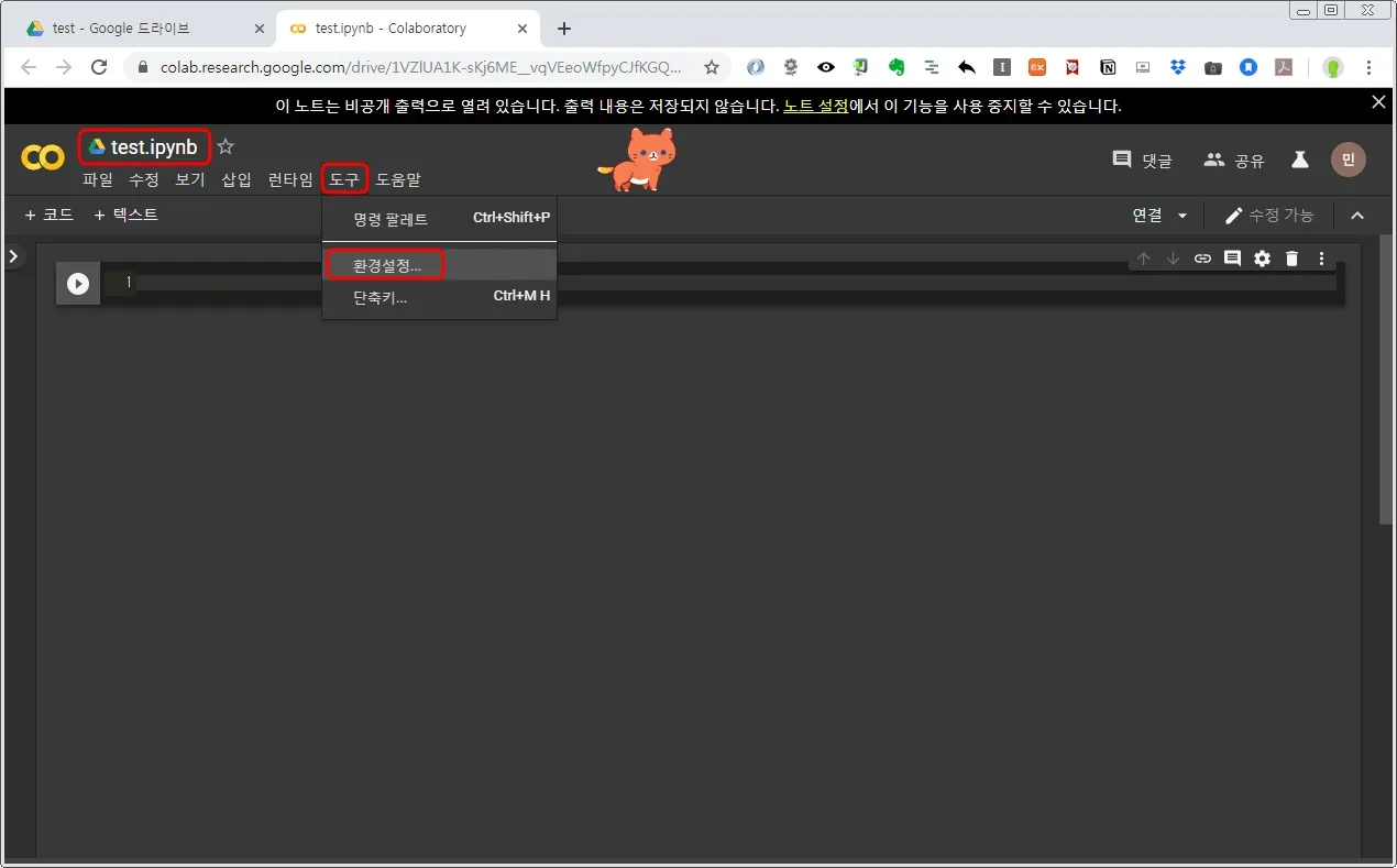 상단 메뉴의 도구 > 환경설정 을 클릭한다.