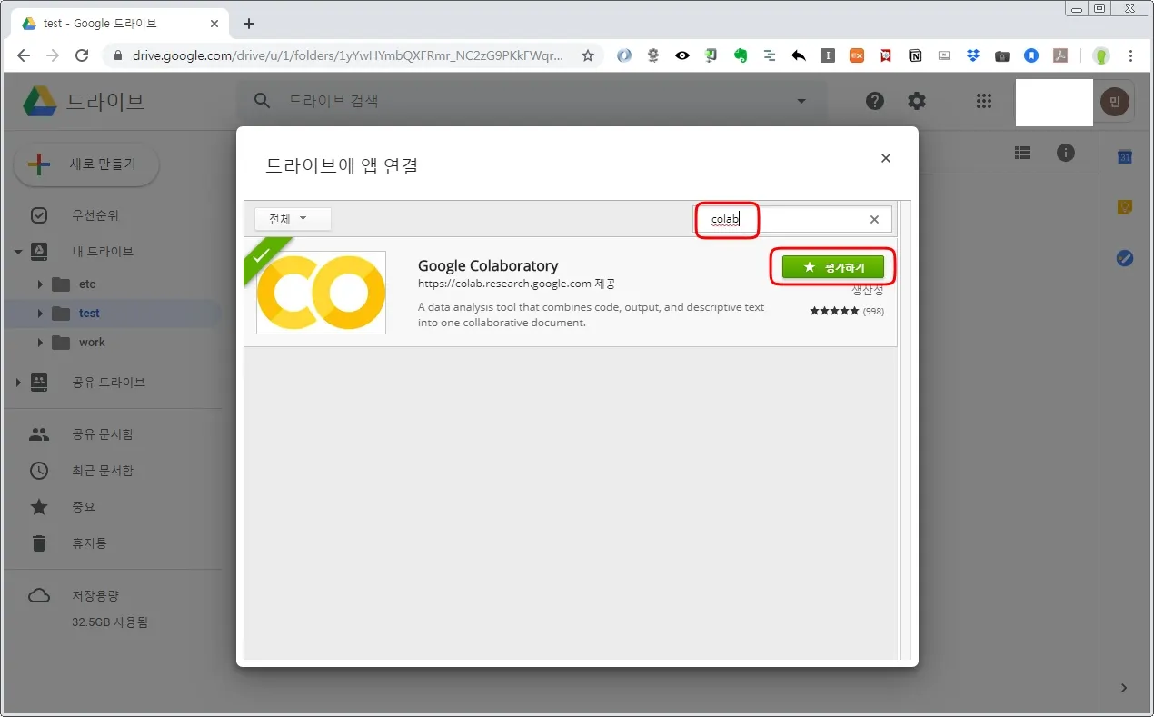 새로 뜬 팝업의 우측 상단에 colab이라는 검색어를 입력하면 아래 그림과 같이 Google Colaboratory 앱이 등장한다. 검색어 바로 밑에있는 녹색 연결하기 버튼을 누른다. (필자의 경우 이미 연결했기 때문에 평가하기 버튼으로 보이고 있다)