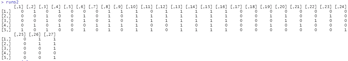 for(i in 1:num.starts){runs2[i,] = rbinom(m,1,.5)}