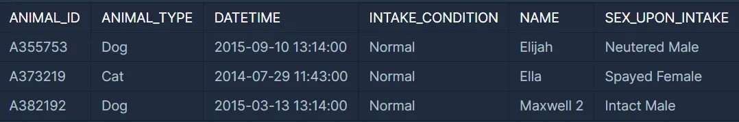 ANIMAL_ID, ANIMAL_TYPE, DATETIME, INTAKE_CONDITION, NAME, SEX_UPON_INTAKE