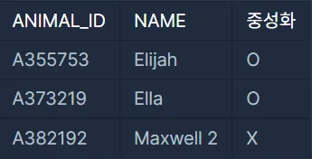 는 각각 동물의 아이디, 생물 종, 보호 시작일, 보호 시작 시 상태, 이름, 성별 및 중성화 여부를 나타냅니다.