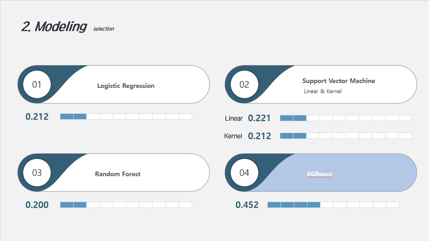 XGBoost를 최종 모델로 선정하였으며, 모델 성능은 다음과 같다.