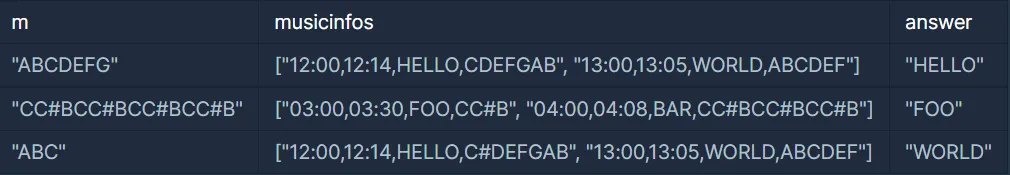 입력으로 네오가 기억한 멜로디를 담은 문자열 m과 방송된 곡의 정보를 담고 있는 배열 musicinfos가 주어진다.