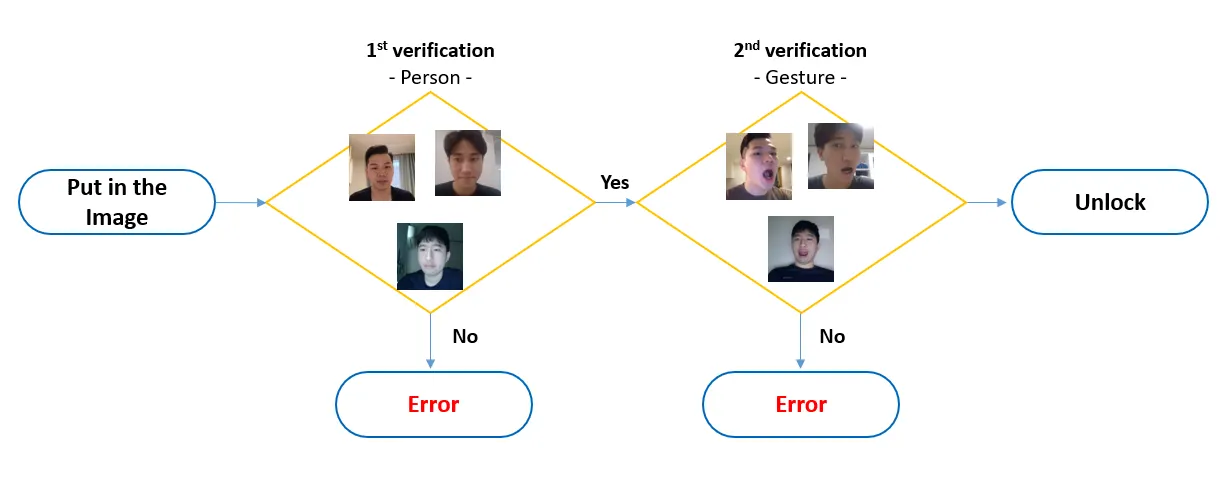 이중 보완 장치를 고안했던 이유는 현재 우리의 Input Data가 조원들의 사진밖에 없었기 때문에 조원들과 유사한 얼굴을 가진 사람이라면 보완이 뚫릴 수 있다는 한계가 존재했기 때문이다. 그러나 결국 Gesture 마저도 아는 사람이 나타나면 보완은 뚫릴 수 밖에 없다. 또한 Gesture의 Label이 입을 연 것과 닫은 것 두 가지밖에 없는 것도 한계점이 될 수 있다. 이를 극복하기 위해서는