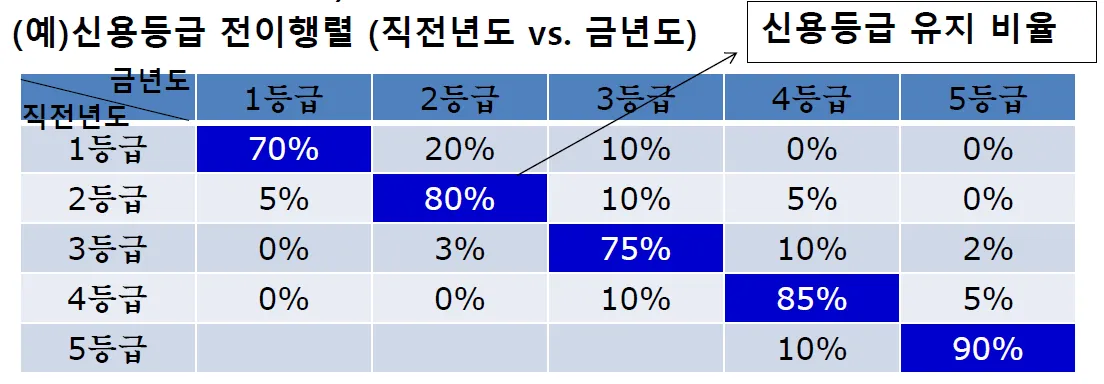 신용등급 전이행렬(Credit Rating Transition Matrix)을 사용하여 이것을 판정한다.