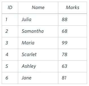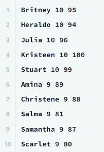 이때 Grade를 기준으로 내림차순 정렬하고 이름을 기준으로 오름차순 정렬한 뒤 Name, Grade, Marks를 조회하면 다음과 같다.