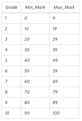 WHERE Marks BETWEEN Min_Mark AND Max_Mark