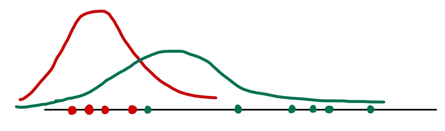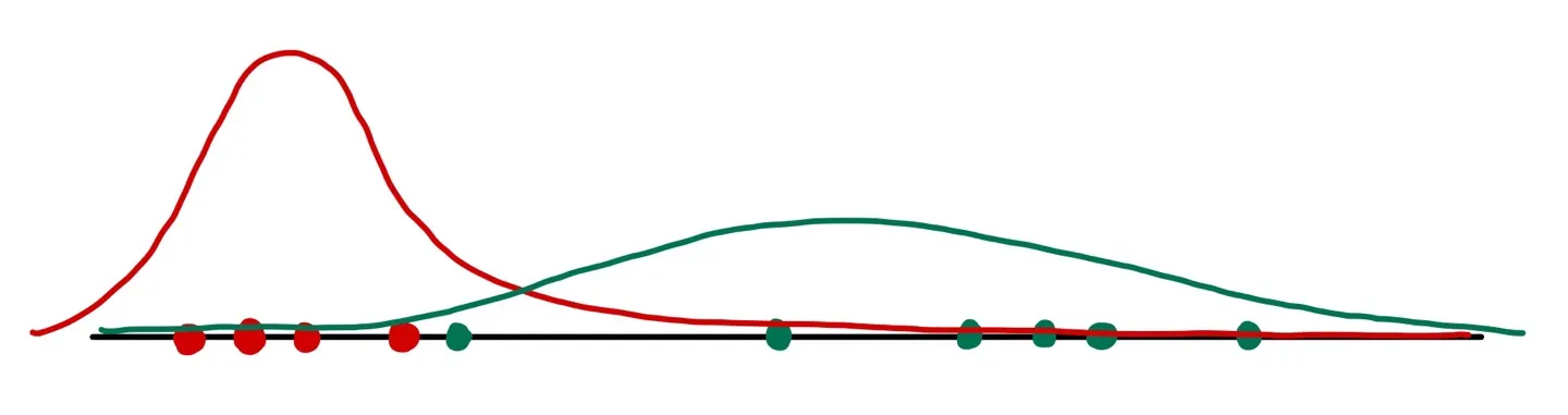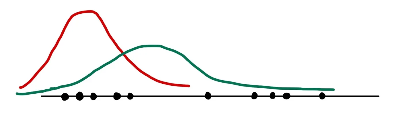 예를 들어, 다음 그림과 같이 2개의 Gaussian distribution이 합쳐진 GMM에서 온 것으로 추정되어지는 값들이 있다고 하자.
