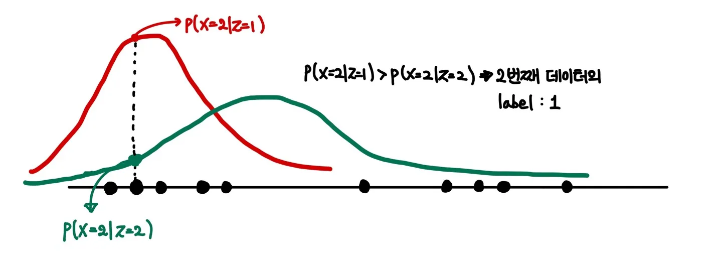 그럼 이제 각각의 데이터들에 대하여 확률값(Likelihood)을 구하고, labeling을 수행해줄 수 있다. 예를 들면, 두 번째 데이터에 대하여 과 를 비교하여 더 큰 확률값을 가지는 쪽으로 labeling을 수행하는 것.