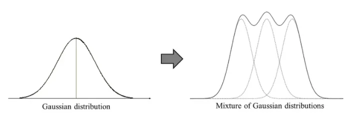 K 개의 Gaussian distribution이 합져져있다고 가정했을 때, Gaussian probability density function은 다음과 같다.