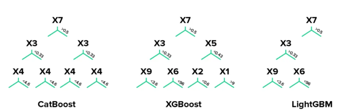 XGBoost의 Level-wise 방식을 사용하지만 대칭적(symmetric)으로 Tree를 생성해 과적합을 최소화한다. 이처럼 동일한 레벨의 Tree에서는 동일한 cut-offf를 사용하는 ODT(Obilvious Decision Tree)로 Tree를 생성하기 때문에 메모리 효율 또한 높일 수 있다.