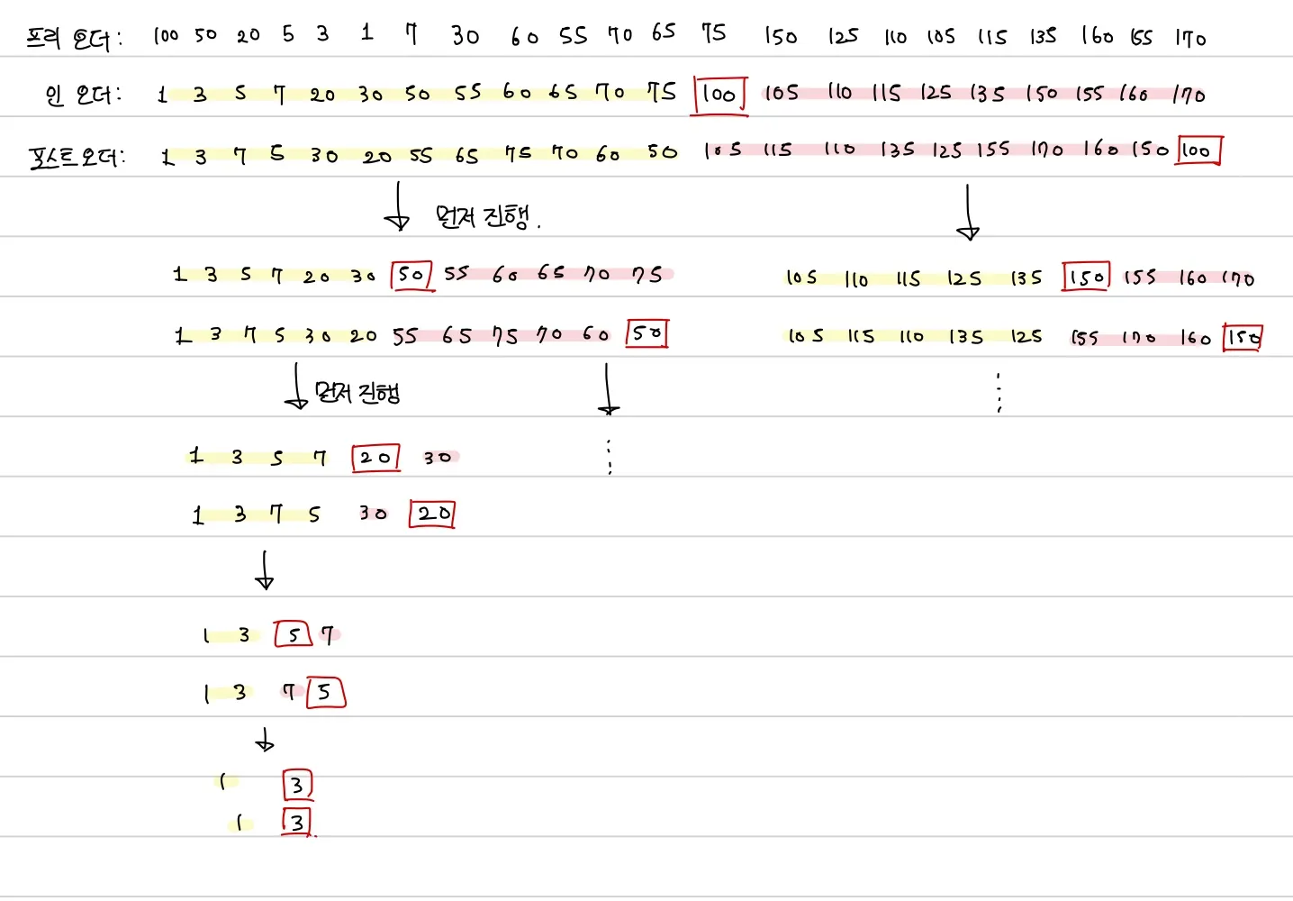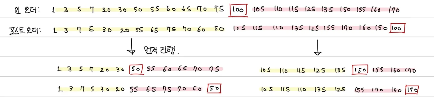 3) 포스트 오더 리스트에서 왼쪽 서브 트리 탐색 범위와 오른쪽 서브 트리 탐색 범위