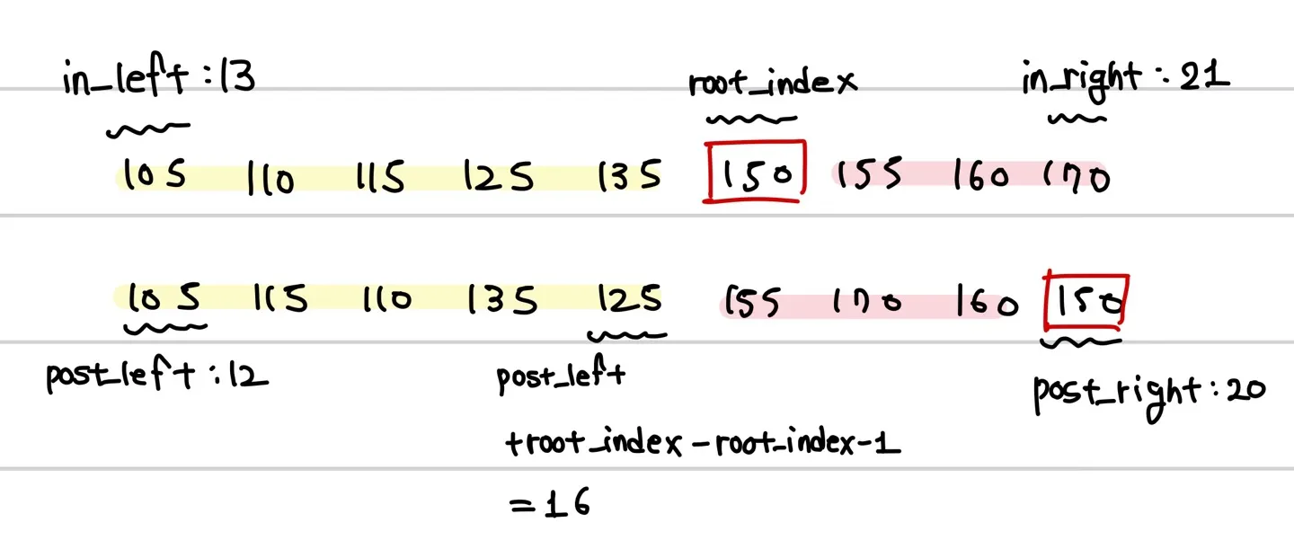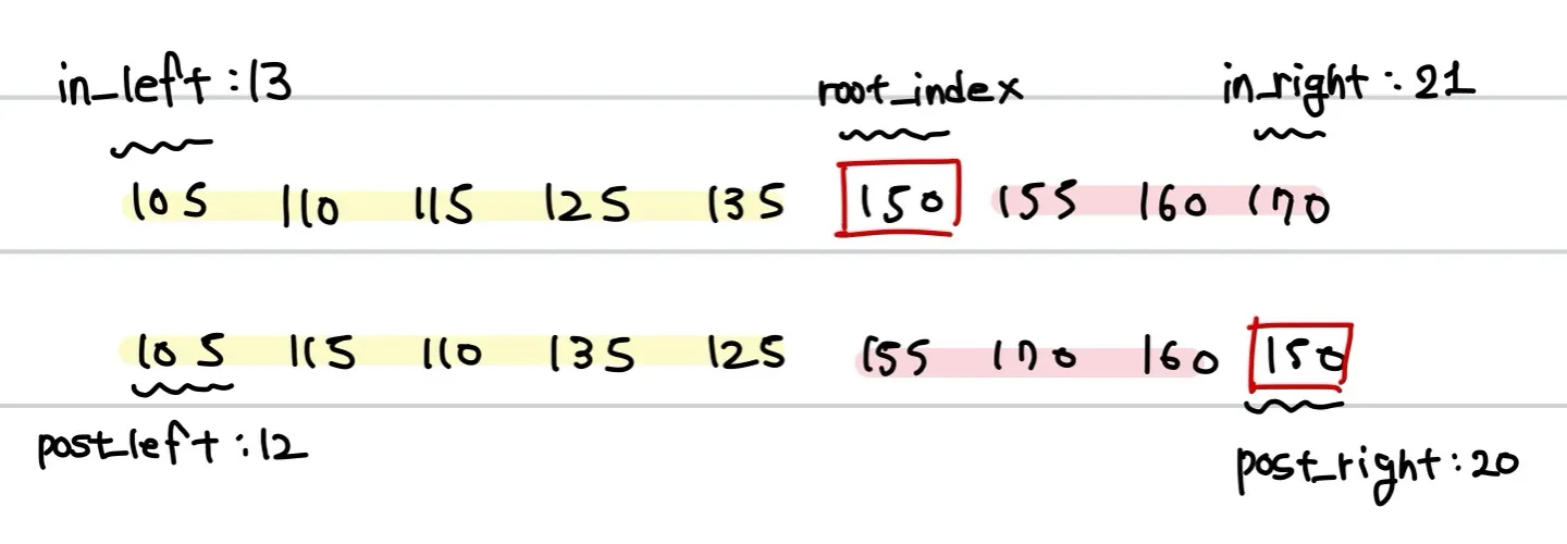 인 오더 리스트 기준으로 왼쪽 서브 트리 탐색 범위는 in_left ~ root_index-1이고 오른쪽 서브 트리는 root_index + 1 ~ in_right 까지이다.