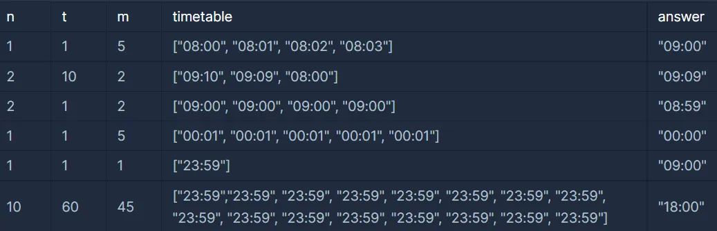 일찍 나와서 셔틀을 기다리는 것이 귀찮았던 콘은, 일주일간의 집요한 관찰 끝에 어떤 크루가 몇 시에 셔틀 대기열에 도착하는지 알아냈다. 콘이 셔틀을 타고 사무실로 갈 수 있는 도착 시각 중 제일 늦은 시각을 구하여라.