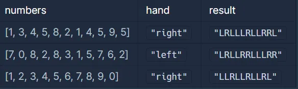 왼손 엄지손가락을 사용한 경우는 L, 오른손 엄지손가락을 사용한 경우는 R을 순서대로 이어붙여 문자열 형태로 return 해주세요.