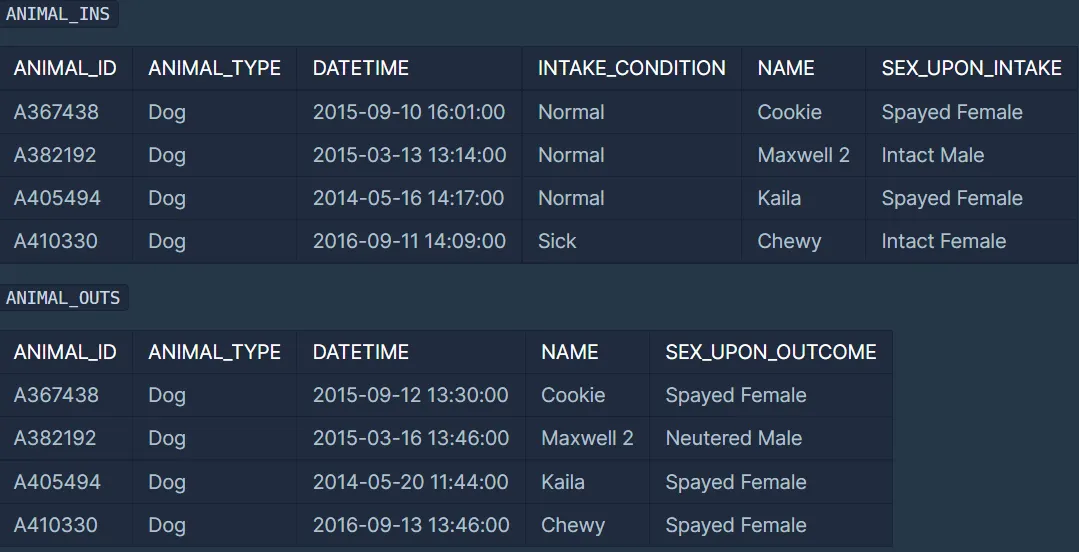 예를 들어, ANIMAL_INS 테이블과 ANIMAL_OUTS 테이블이 다음과 같다면