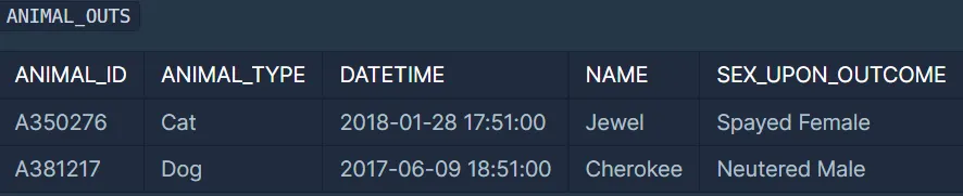 ANIMAL_OUTS 테이블은 동물 보호소에서 입양 보낸 동물의 정보를 담은 테이블입니다. ANIMAL_OUTS 테이블 구조는 다음과 같으며, ANIMAL_ID, ANIMAL_TYPE, DATETIME, NAME, SEX_UPON_OUTCOME는 각각 동물의 아이디, 생물 종, 입양일, 이름, 성별 및 중성화 여부를 나타냅니다. ANIMAL_OUTS 테이블의 ANIMAL_ID는 ANIMAL_INS의 ANIMAL_ID의 외래 키입니다.