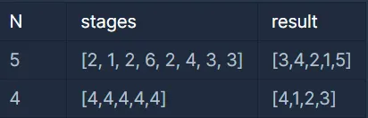 전체 스테이지의 개수 N, 게임을 이용하는 사용자가 현재 멈춰있는 스테이지의 번호가 담긴 배열 stages가 매개변수로 주어질 때, 실패율이 높은 스테이지부터 내림차순으로 스테이지의 번호가 담겨있는 배열을 return 하도록 solution 함수를 완성하라.