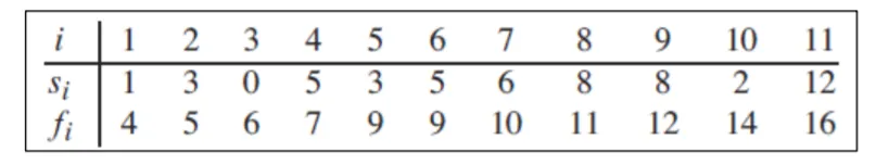 예를 들어 위의 예시에서는 처음에 가장 빨리 끝나는 것은 이다. 그리고 그 다음 가능한 활동들 중 가장 빨리 끝나는 것은 이다. 왜냐하면 시작 시간이 4이상이고 끝나는 시간이 가장 작은 것은 이기 때문이다.