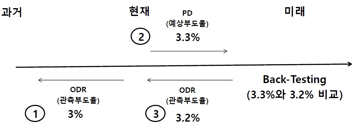 모형 개발 후에 일정 시간이 지나 모형 검증 시점이 되면, 그 시점에서 다시 과거를 돌아보며, 과거에 예측한 PD와 예측 후 실제 발생한 부도율을 비교함