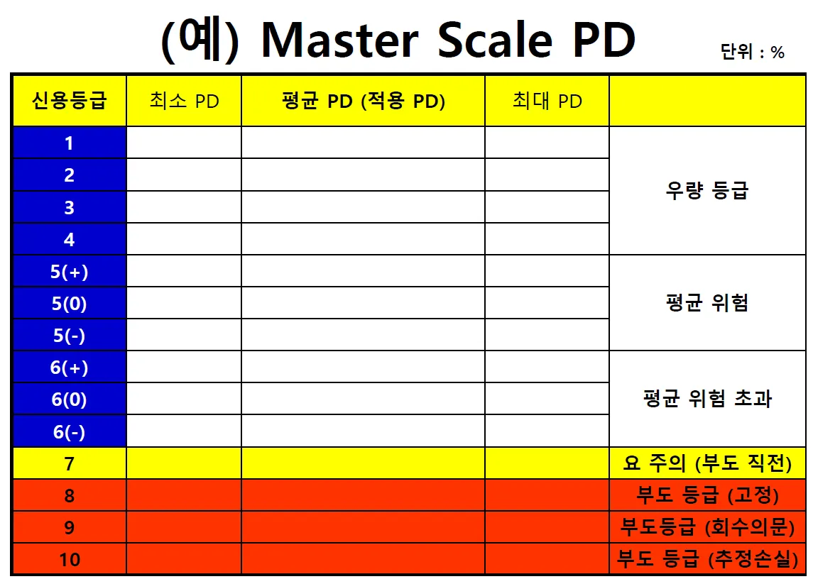 Master Scale PD: 모형의 종류와 상관없이, 모든 모형에서 공동으로 사용할 수 있는 신용등급별 PD