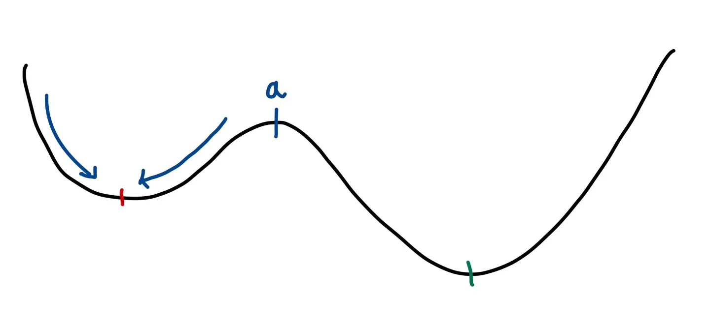 우선 시작점(starting point)이 a 지점보다 왼쪽에 있다고 하면(여기서 왼쪽 골짜기에 있다고 표현해보자) 우리는 계속해서 더 작은 값을 찾아갈 것이기 때문에 local minimum(빨간색 지점)을 향해 값을 update를 할 것이다.