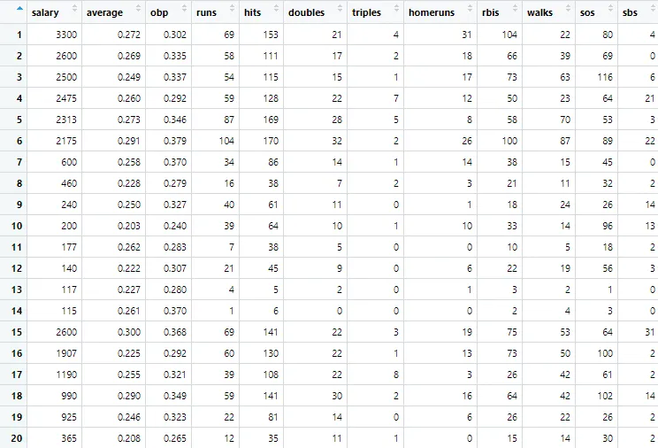 337명의 야구선수에 대하여 그들의 1991년의 27개의 baseball performance statistics와 1992년의 salary 정보 데이터가 있다.
