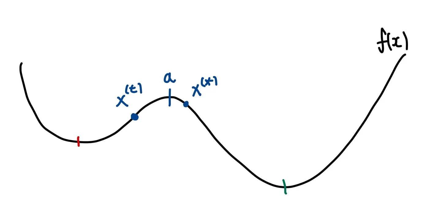 만약 위의 예시에서 함숫값이 더 작은 값만 다음 update 값으로 채택한다면, 이기 때문에 는 global minimum의 골짜기에 포함되어있음에도 불구하고 다음 update 값으로 채택되지 않을 것이다. 따라서 우리는 비록 제시된 후보값의 함숫값이 기존의 값보다 더 높더라도 특정한 확률로 후보값을 채택하는 방식을 사용해야 한다.