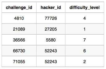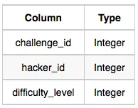 Challenges: The challenge_id is the id of the challenge, the hacker_id is the id of the hacker who created the challenge, and difficulty_level is the level of difficulty of the challenge.