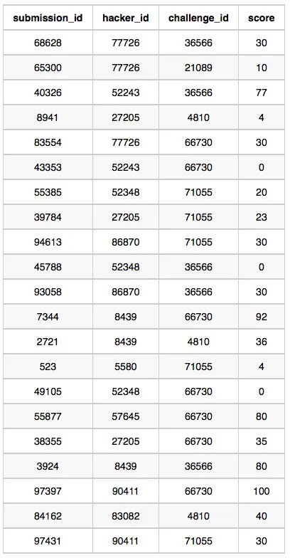 Submissions: The submission_id is the id of the submission, hacker_id is the id of the hacker who made the submission, challenge_id is the id of the challenge that the submission belongs to, and score is the score of the submission.