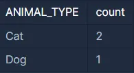 고양이는 2마리, 개는 1마리 들어왔습니다. 따라서 SQL문을 실행하면 다음과 같이 나와야 합니다.
