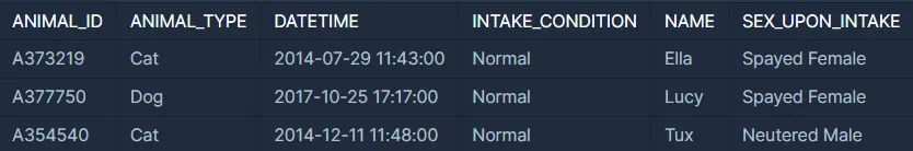 ANIMAL_ID, ANIMAL_TYPE, DATETIME, INTAKE_CONDITION, NAME, SEX_UPON_INTAKE