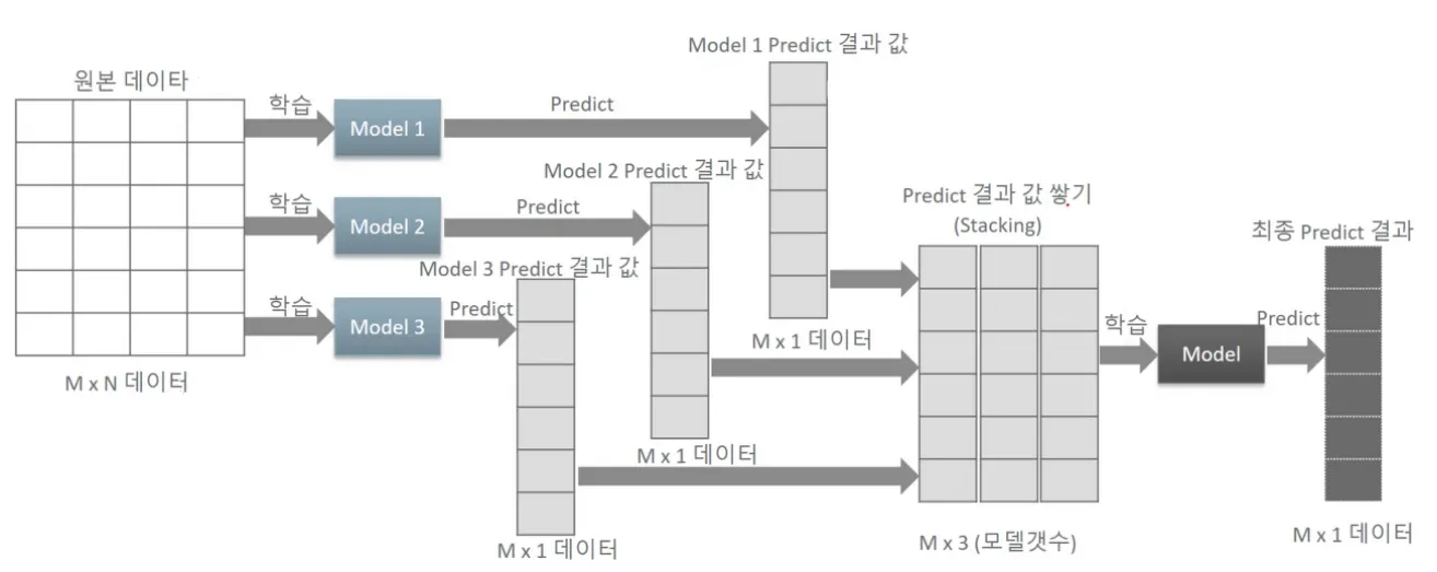 Bagging과 마찬가지로 병렬적(parallel)으로 학습하지만 동일한 데이터셋을 사용하며 각각의 모델은 서로 다른 알고리즘을 학습해 예측을 수행한다. 각각의 예측값이 새로운 feature가 되도록 그대로 쌓아 최종 데이터셋을 생성하고 사전에 설정해두었던 메타 모델을 학습해 최종 예측값을 얻는다.