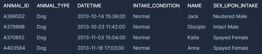 ANIMAL_ID, ANIMAL_TYPE, DATETIME, INTAKE_CONDITION, NAME, SEX_UPON_INTAKE