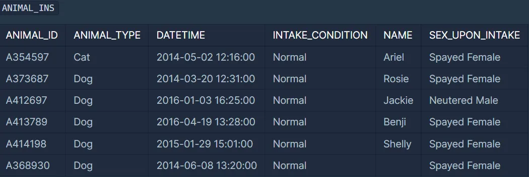 ANIMAL_ID, ANIMAL_TYPE, DATETIME, INTAKE_CONDITION, NAME, SEX_UPON_INTAKE