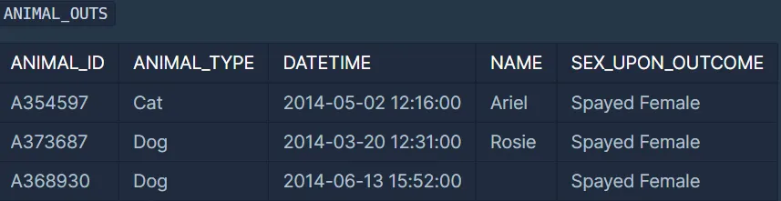 ANIMAL_OUTS 테이블은 동물 보호소에서 입양 보낸 동물의 정보를 담은 테이블입니다. ANIMAL_OUTS 테이블 구조는 다음과 같으며, ANIMAL_ID, ANIMAL_TYPE, DATETIME, NAME, SEX_UPON_OUTCOME는 각각 동물의 아이디, 생물 종, 입양일, 이름, 성별 및 중성화 여부를 나타냅니다. ANIMAL_OUTS 테이블의 ANIMAL_ID는 ANIMAL_INS의 ANIMAL_ID의 외래 키입니다.