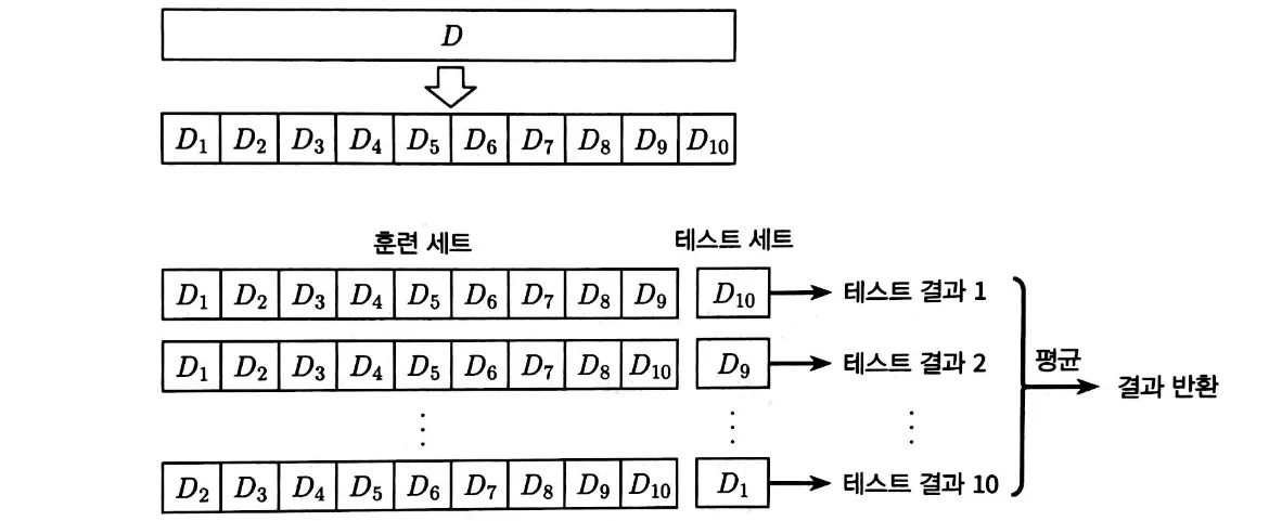 k-fold는 샘플에서 k-1개의 동일한 크기의 부분집합들을 만들어 훈련 세트로 사용하고 나머지 하나의 부분집합을 테스트 세트(또는 검증 세트)로 사용하는 것을 말한다. 이렇게 하면 총 k개의 훈련/테스트 세트가 만들어지며 k번의 훈련과 테스트를 거쳐 k개의 테스트 결과값의 평균을 얻을 수 있다.