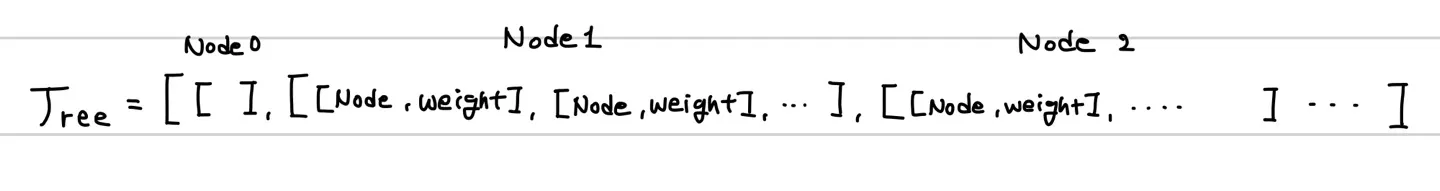 Tree[a].append([b,weight]) # Tree[Node]에 [연결된 node, weight] 형식으로 Tree를 쌓는다.