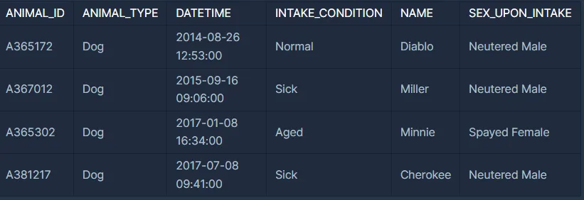 ANIMAL_ID, ANIMAL_TYPE, DATETIME, INTAKE_CONDITION, NAME, SEX_UPON_INTAKE